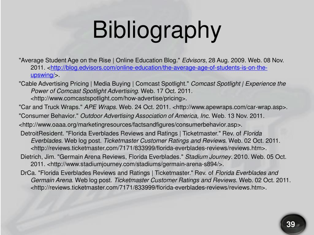 Bibliography "Average Student Age on the Rise | Online Education Blog." Edvisors, 28 Aug. 2009. Web. 08 Nov. 2011. <http://blog.edvisors.com/online-education/the-average-age-of-students-is-on-the-upswing/>. "Cable Advertising Pricing | Media Buying | Comcast Spotlight." Comcast Spotlight | Experience the Power of Comcast Spotlight Advertising. Web. 17 Oct. 2011. <http://www.comcastspotlight.com/how-advertise/pricing>. "Car and Truck Wraps." APE Wraps. Web. 24 Oct. 2011. <http://www.apewraps.com/car-wrap.asp>. "Consumer Behavior." Outdoor Advertising Association of America, Inc. Web. 13 Nov. 2011. <http://www.oaaa.org/marketingresources/factsandfigures/consumerbehavior.asp>. DetroitResident. "Florida Everblades Reviews and Ratings | Ticketmaster." Rev. of Florida Everblades. Web log post. Ticketmaster Customer Ratings and Reviews. Web. 02 Oct. 2011. <http://reviews.ticketmaster.com/7171/833999/florida-everblades-reviews/reviews.htm>. Dietrich, Jim. "Germain Arena Reviews, Florida Everblades." Stadium Journey. 2010. Web. 05 Oct. 2011. <http://www.stadiumjourney.com/stadiums/germain-arena-s894/>. DrCa. "Florida Everblades Reviews and Ratings | Ticketmaster." Rev. of Florida Everblades and Germain Arena. Web log post. Ticketmaster Customer Ratings and Reviews. Web. 02 Oct. 2011. <http://reviews.ticketmaster.com/7171/833999/florida-everblades-reviews/reviews.htm>.