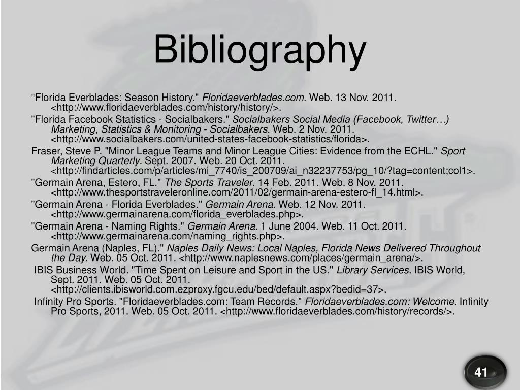 Bibliography "Florida Everblades: Season History." Floridaeverblades.com. Web. 13 Nov. 2011. <http://www.floridaeverblades.com/history/history/>. "Florida Facebook Statistics - Socialbakers." Socialbakers Social Media (Facebook, Twitter…) Marketing, Statistics & Monitoring - Socialbakers. Web. 2 Nov. 2011. <http://www.socialbakers.com/united-states-facebook-statistics/florida>. Fraser, Steve P. "Minor League Teams and Minor League Cities: Evidence from the ECHL." Sport Marketing Quarterly. Sept. 2007. Web. 20 Oct. 2011. <http://findarticles.com/p/articles/mi_7740/is_200709/ai_n32237753/pg_10/?tag=content;col1>. "Germain Arena, Estero, FL." The Sports Traveler. 14 Feb. 2011. Web. 8 Nov. 2011. <http://www.thesportstraveleronline.com/2011/02/germain-arena-estero-fl_14.html>. "Germain Arena - Florida Everblades." Germain Arena. Web. 12 Nov. 2011. <http://www.germainarena.com/florida_everblades.php>. "Germain Arena - Naming Rights." Germain Arena. 1 June 2004. Web. 11 Oct. 2011. <http://www.germainarena.com/naming_rights.php>. Germain Arena (Naples, FL)." Naples Daily News: Local Naples, Florida News Delivered Throughout the Day. Web. 05 Oct. 2011. <http://www.naplesnews.com/places/germain_arena/>. IBIS Business World. "Time Spent on Leisure and Sport in the US." Library Services. IBIS World, Sept. 2011. Web. 05 Oct. 2011. <http://clients.ibisworld.com.ezproxy.fgcu.edu/bed/default.aspx?bedid=37>. Infinity Pro Sports. "Floridaeverblades.com: Team Records." Floridaeverblades.com: Welcome. Infinity Pro Sports, 2011. Web. 05 Oct. 2011. <http://www.floridaeverblades.com/history/records/>.