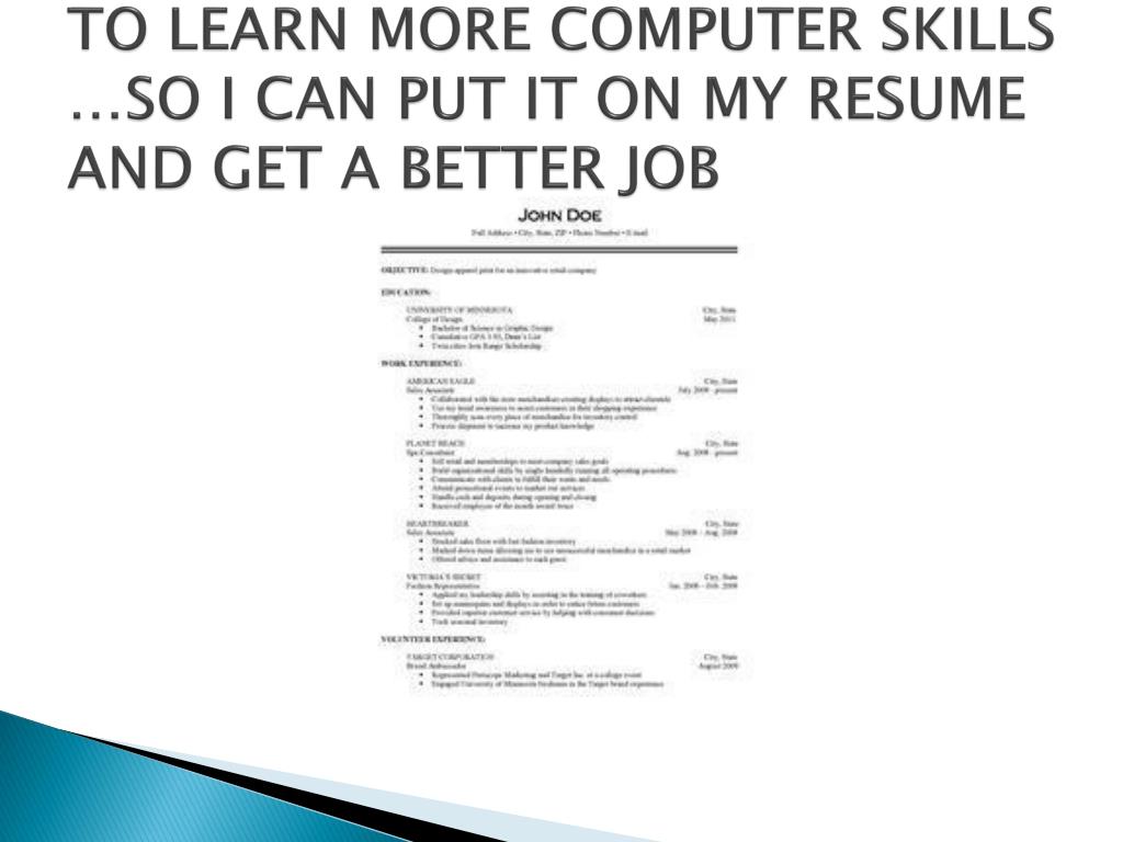 TO LEARN MORE COMPUTER SKILLS …SO I CAN PUT IT ON MY RESUME AND GET A BETTER JOB