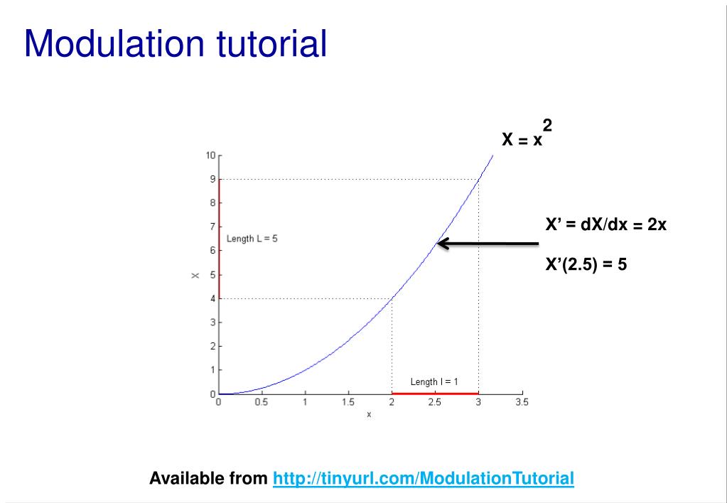Modulation tutorial X = x2 X’ = dX/dx = 2x X’(2.5) = 5 Available from http://tinyurl.com/ModulationTutorial
