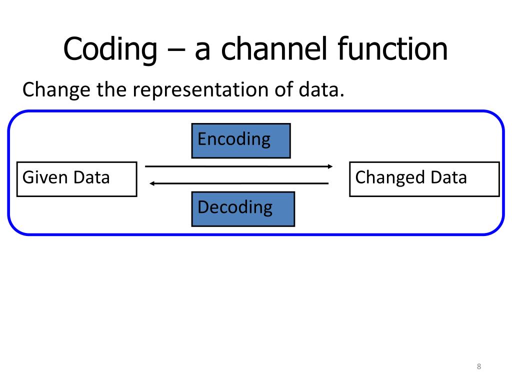 Coding – a channel function Change the representation of data. Encoding Given Data Changed Data Decoding