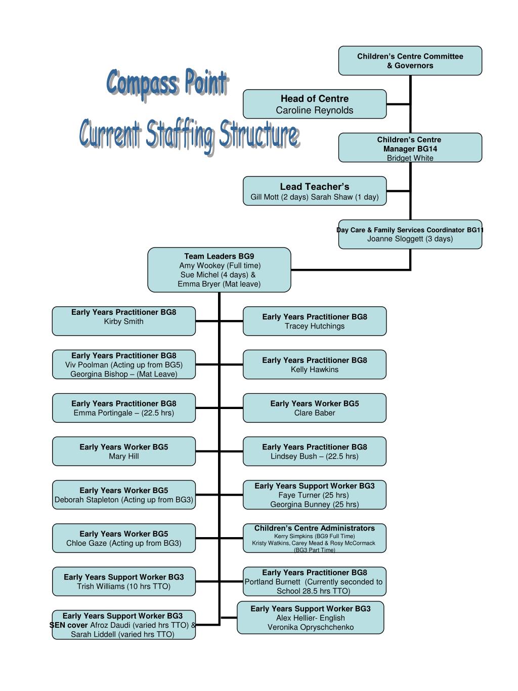 Explore the current staffing structure of Compass Point Children's Centre, featuring dedicated professionals responsible for child care, early years support, and administration. Meet our passionate team members and learn about their roles in providing a nurturing environment for children.