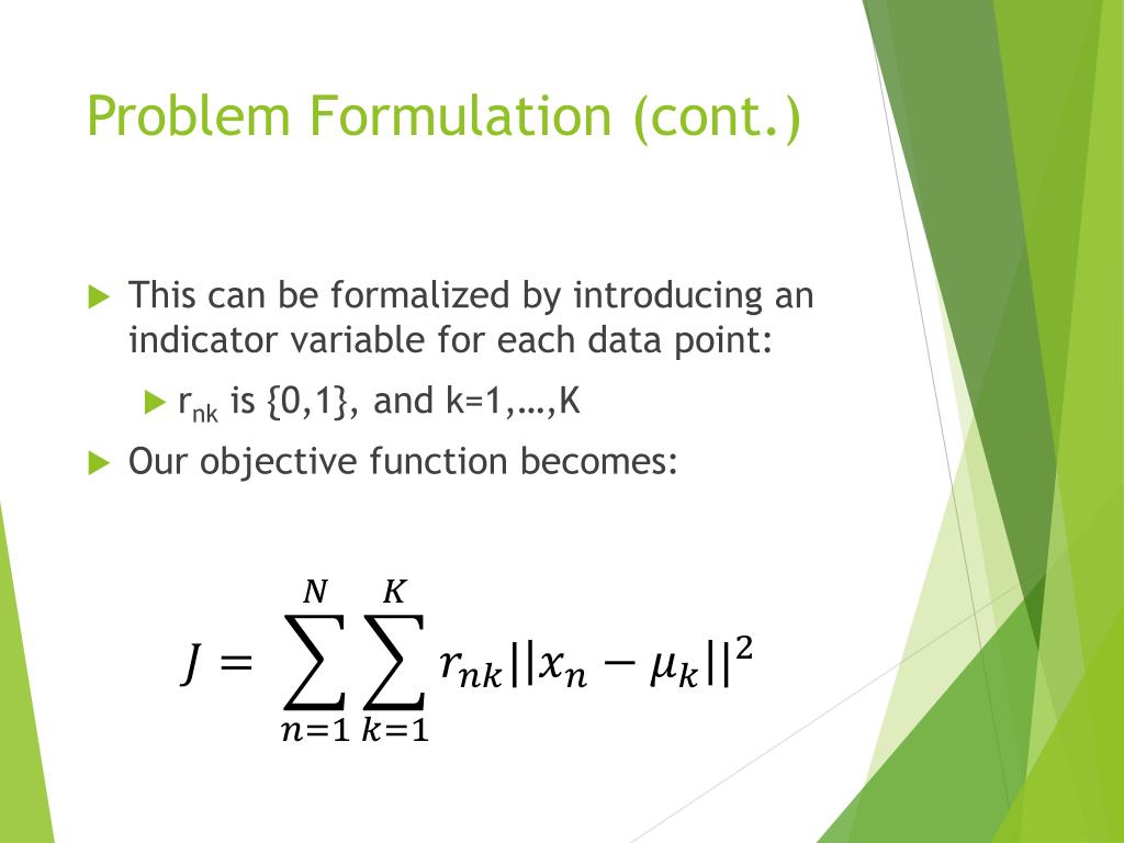 Problem Formulation Given a data set of {x1,…,xN} which consists of N random instances of a random D-dimensional Euclidean variable x. Introduce a set of K prototype vectors, µk where k=1,…,K and µk corresponds to the mean of the kth cluster.