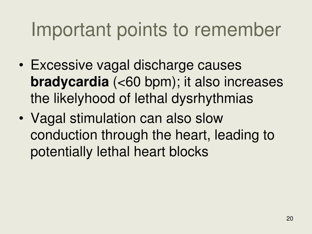 Important points to remember • Excessive vagal discharge causes bradycardia (<60 bpm); it also increases the likelyhood of lethal dysrhythmias • Vagal stimulation can also slow conduction through the heart, leading to potentially lethal heart blocks
