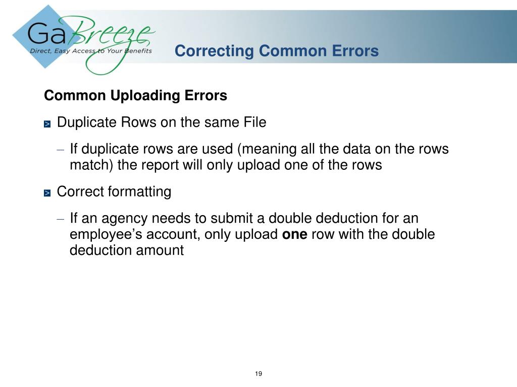 Correcting Common Errors • Common Uploading Errors • Duplicate Rows on the same File • If duplicate rows are used (meaning all the data on the rows match) the report will only upload one of the rows • Correct formatting • If an agency needs to submit a double deduction for an employee’s account, only upload one row with the double deduction amount