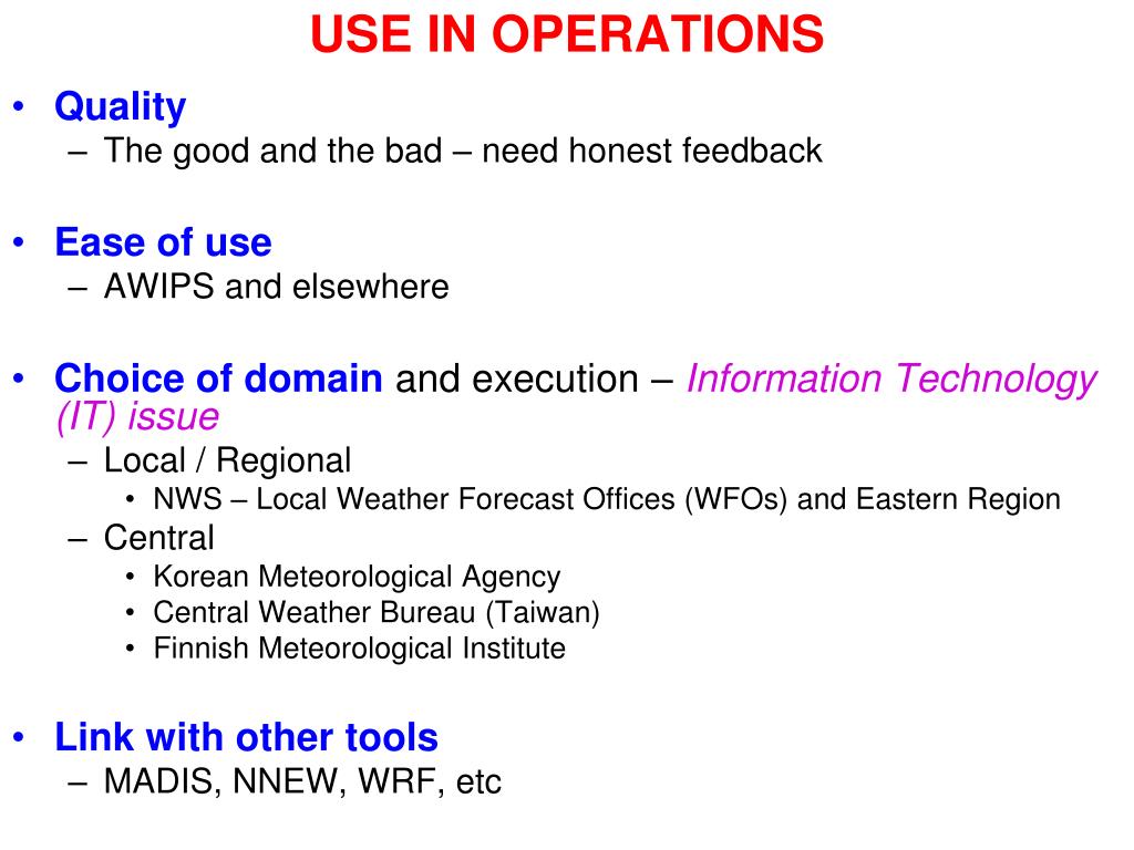 USE IN OPERATIONS • Quality • The good and the bad – need honest feedback • Ease of use • AWIPS and elsewhere • Choice of domain and execution – Information Technology (IT) issue • Local / Regional • NWS – Local Weather Forecast Offices (WFOs) and Eastern Region • Central • Korean Meteorological Agency • Central Weather Bureau (Taiwan) • Finnish Meteorological Institute • Link with other tools • MADIS, NNEW, WRF, etc