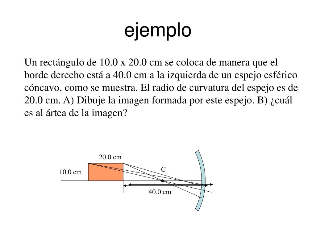 ejemplo Un rectángulo de 10.0 x 20.0 cm se coloca de manera que el borde derecho está a 40.0 cm a la izquierda de un espejo esférico cóncavo, como se muestra. El radio de curvatura del espejo es de 20.0 cm. A) Dibuje la imagen formada por este espejo. B) ¿cuál es al ártea de la imagen? 20.0 cm C 10.0 cm 40.0 cm
