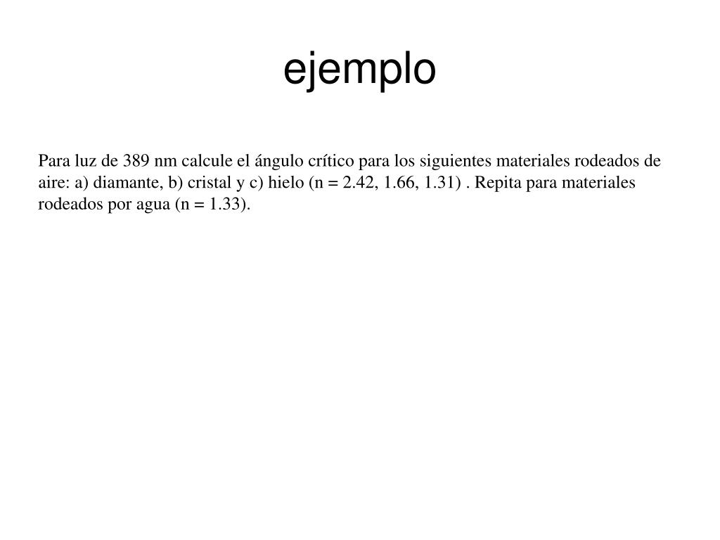 ejemplo Para luz de 389 nm calcule el ángulo crítico para los siguientes materiales rodeados de aire: a) diamante, b) cristal y c) hielo (n = 2.42, 1.66, 1.31) . Repita para materiales rodeados por agua (n = 1.33).