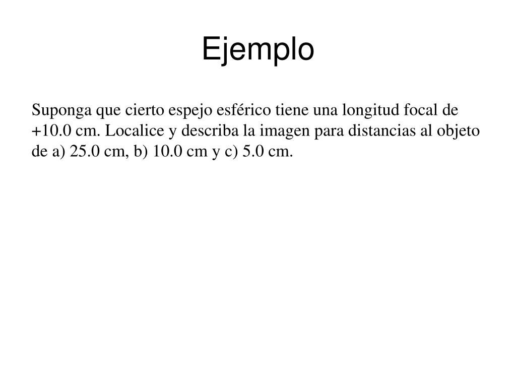 Ejemplo Suponga que cierto espejo esférico tiene una longitud focal de +10.0 cm. Localice y describa la imagen para distancias al objeto de a) 25.0 cm, b) 10.0 cm y c) 5.0 cm.