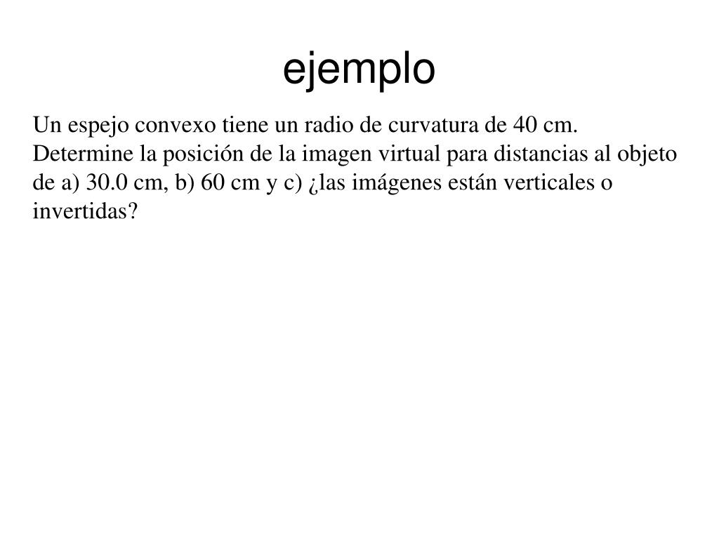 ejemplo Un espejo convexo tiene un radio de curvatura de 40 cm. Determine la posición de la imagen virtual para distancias al objeto de a) 30.0 cm, b) 60 cm y c) ¿las imágenes están verticales o invertidas?