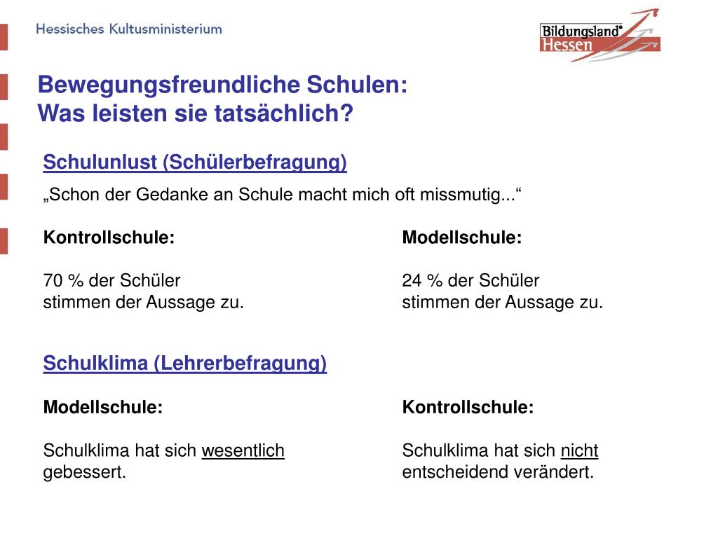 Bewegungsfreundliche Schulen: Was leisten sie tatsächlich? Schulunlust (Schülerbefragung) „Schon der Gedanke an Schule macht mich oft missmutig...“ Kontrollschule: Modellschule: 70 % der Schüler 24 % der Schüler stimmen der Aussage zu. stimmen der Aussage zu. Schulklima (Lehrerbefragung) Modellschule: Kontrollschule: Schulklima hat sich wesentlich Schulklima hat sich nicht gebessert. entscheidend verändert.