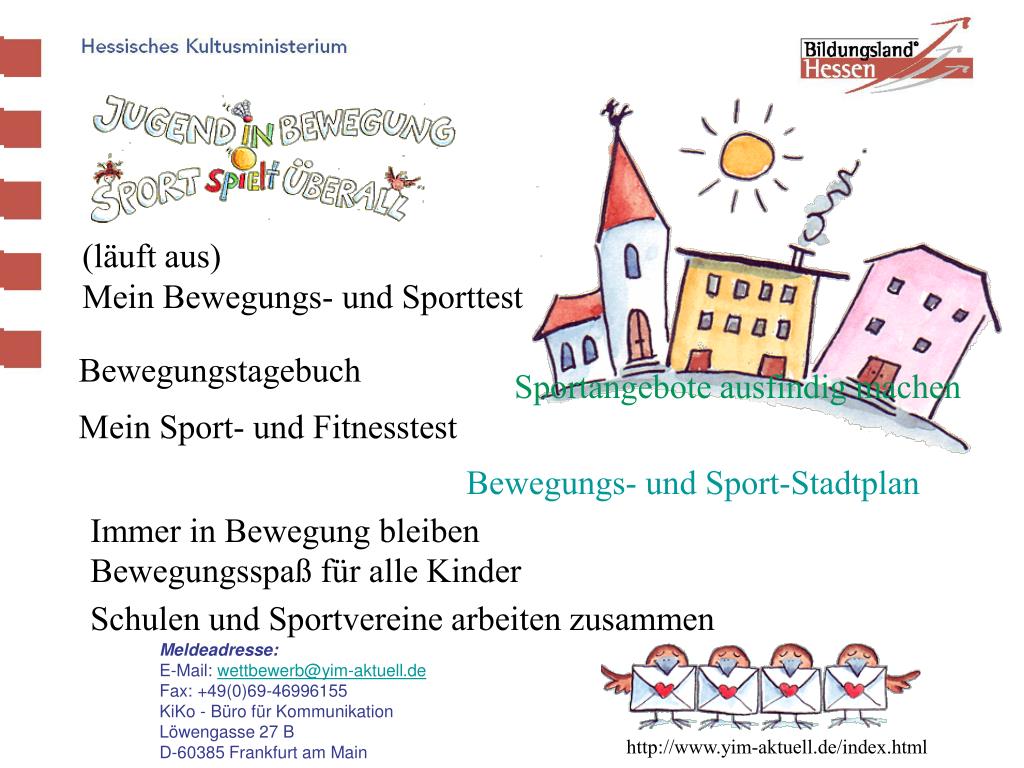(läuft aus) Mein Bewegungs- und Sporttest Bewegungstagebuch Sportangebote ausfindig machen Mein Sport- und Fitnesstest Bewegungs- und Sport-Stadtplan Immer in Bewegung bleiben Bewegungsspaß für alle Kinder Schulen und Sportvereine arbeiten zusammen http://www.yim-aktuell.de/index.html