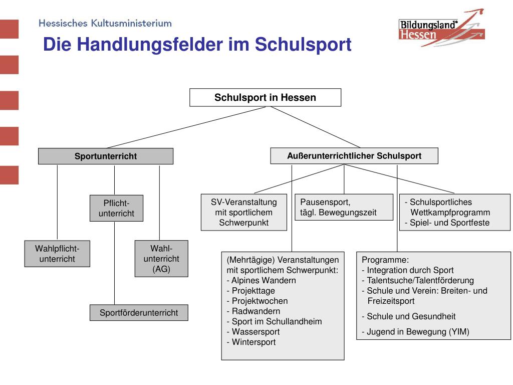 Außerunterrichtlicher Schulsport Sportunterricht SV-Veranstaltung mit sportlichem Schwerpunkt Pausensport,tägl. Bewegungszeit - Schulsportliches Wettkampfprogramm- Spiel- und Sportfeste Pflicht-unterricht Wahl-unterricht (AG) Wahlpflicht-unterricht (Mehrtägige) Veranstaltungen mit sportlichem Schwerpunkt:- Alpines Wandern- Projekttage- Projektwochen- Radwandern- Sport im Schullandheim- Wassersport- Wintersport • Programme:- Integration durch Sport- Talentsuche/Talentförderung- Schule und Verein: Breiten- und Freizeitsport • Schule und Gesundheit • Jugend in Bewegung (YIM) Sportförderunterricht Die Handlungsfelder im Schulsport Schulsport in Hessen