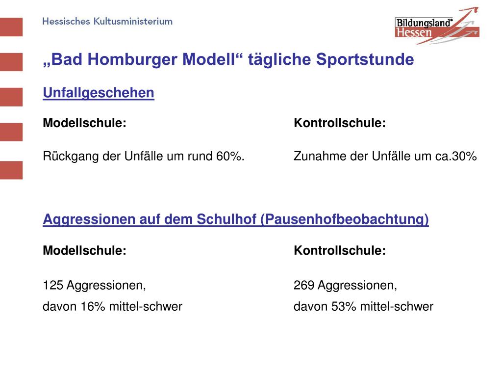 „Bad Homburger Modell“ tägliche Sportstunde Unfallgeschehen Modellschule: Kontrollschule: Rückgang der Unfälle um rund 60%. Zunahme der Unfälle um ca.30% Aggressionen auf dem Schulhof (Pausenhofbeobachtung) Modellschule: Kontrollschule: 125 Aggressionen,269 Aggressionen, davon 16% mittel-schwer davon 53% mittel-schwer