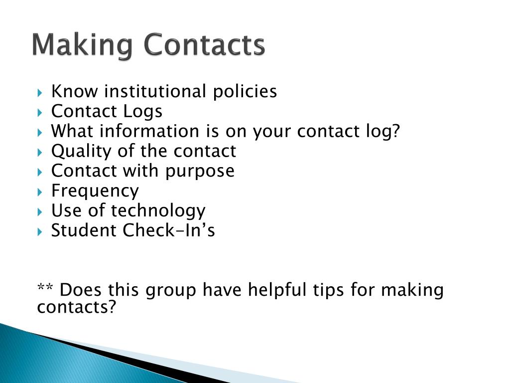 Making Contacts • Know institutional policies • Contact Logs • What information is on your contact log? • Quality of the contact • Contact with purpose • Frequency • Use of technology • Student Check-In’s ** Does this group have helpful tips for making contacts?