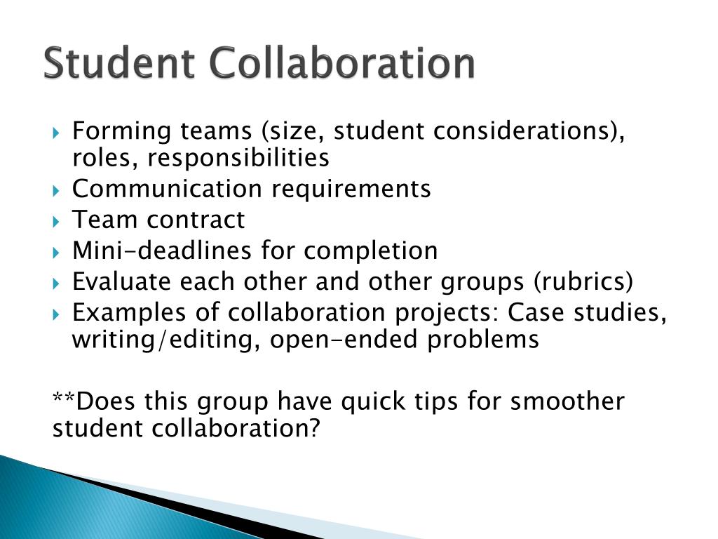 Student Collaboration • Forming teams (size, student considerations), roles, responsibilities • Communication requirements • Team contract • Mini-deadlines for completion • Evaluate each other and other groups (rubrics) • Examples of collaboration projects: Case studies, writing/editing, open-ended problems **Does this group have quick tips for smoother student collaboration?