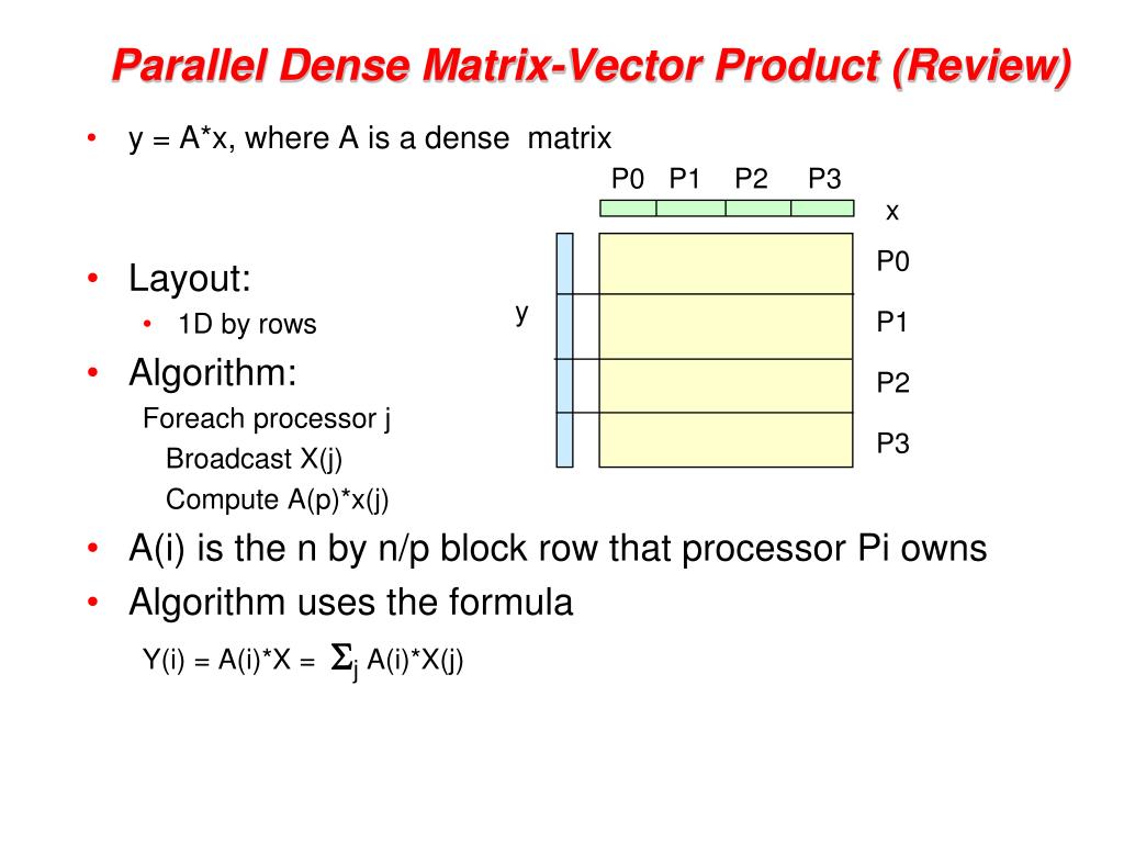 Parallel Dense Matrix-Vector Product (Review) P0 P1 P2 P3 • y = A*x, where A is a dense matrix • Layout: • 1D by rows • Algorithm: Foreach processor j Broadcast X(j) Compute A(p)*x(j) • A(i) is the n by n/p block row that processor Pi owns • Algorithm uses the formula Y(i) = A(i)*X = Sj A(i)*X(j) x P0 P1 P2 P3 y