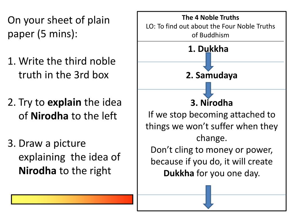 On your sheet of plain paper (5 mins): Write the third noble truth in the 3rd box Try to explain the idea of Nirodha to the left Draw a picture explaining the idea of Nirodha to the right The 4 Noble Truths LO: To find out about the Four Noble Truths of Buddhism 1. Dukkha 2. Samudaya 3. Nirodha If we stop becoming attached to things we won’t suffer when they change. Don’t cling to money or power, because if you do, it will create Dukkha for you one day.