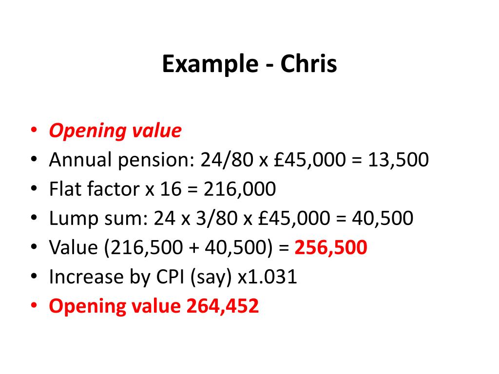 Example - Chris • Opening value • Annual pension: 24/80 x £45,000 = 13,500 • Flat factor x 16 = 216,000 • Lump sum: 24 x 3/80 x £45,000 = 40,500 • Value (216,500 + 40,500) = 256,500 • Increase by CPI (say) x1.031 • Opening value 264,452