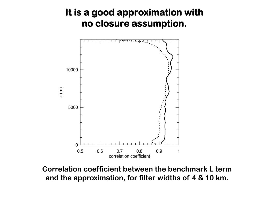 It is a good approximation withno closure assumption. Correlation coefficient between the benchmark L term and the approximation, for filter widths of 4 & 10 km.