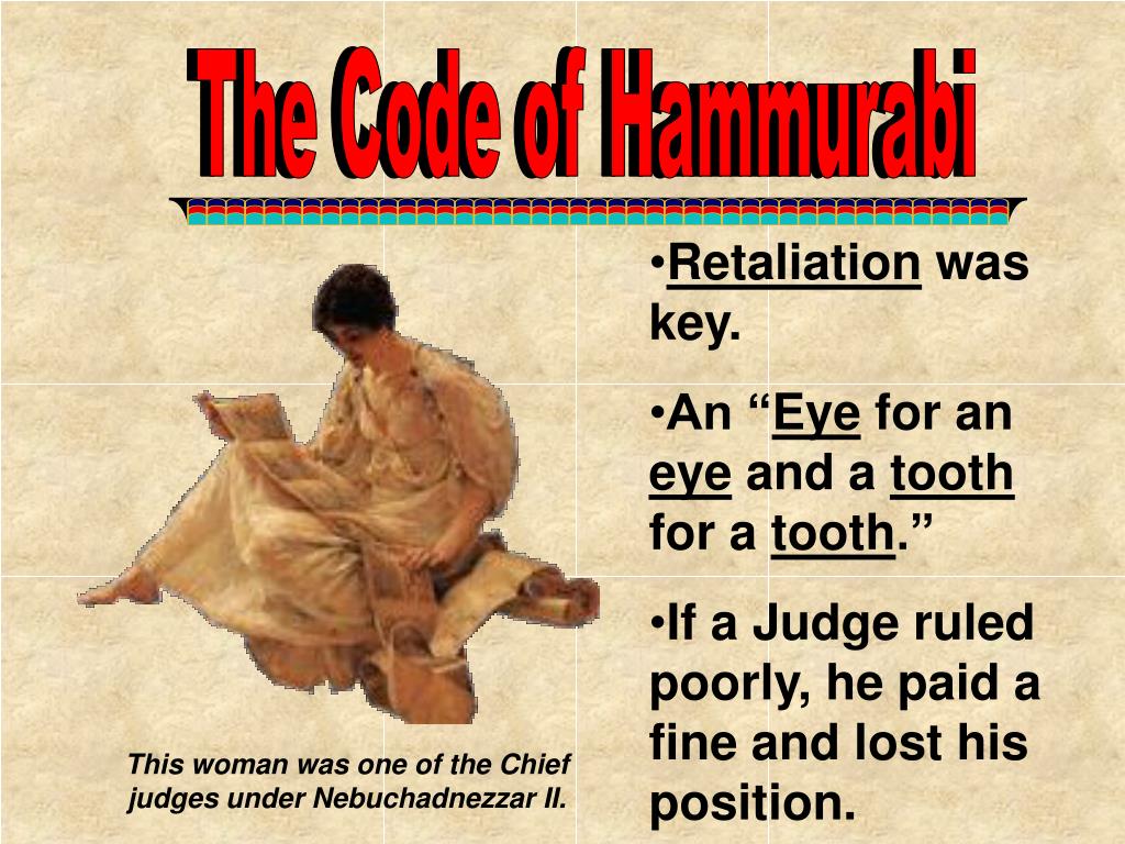 The Code of Hammurabi The Code of Hammurabi • Retaliation was key. • An “Eye for an eye and a tooth for a tooth.” • If a Judge ruled poorly, he paid a fine and lost his position. This woman was one of the Chief judges under Nebuchadnezzar II.