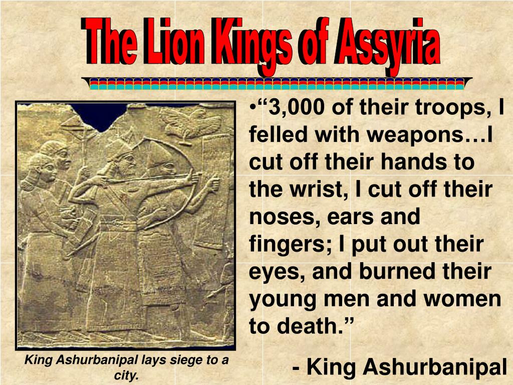The Lion Kings of Assyria The Lion Kings of Assyria • “3,000 of their troops, I felled with weapons…I cut off their hands to the wrist, I cut off their noses, ears and fingers; I put out their eyes, and burned their young men and women to death.” • - King Ashurbanipal King Ashurbanipal lays siege to a city.