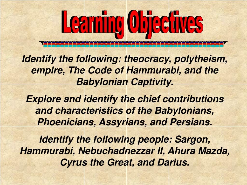 Learning Objectives Learning Objectives Identify the following: theocracy, polytheism, empire, The Code of Hammurabi, and the Babylonian Captivity. Explore and identify the chief contributions and characteristics of the Babylonians, Phoenicians, Assyrians, and Persians. Identify the following people: Sargon, Hammurabi, Nebuchadnezzar II, Ahura Mazda, Cyrus the Great, and Darius.