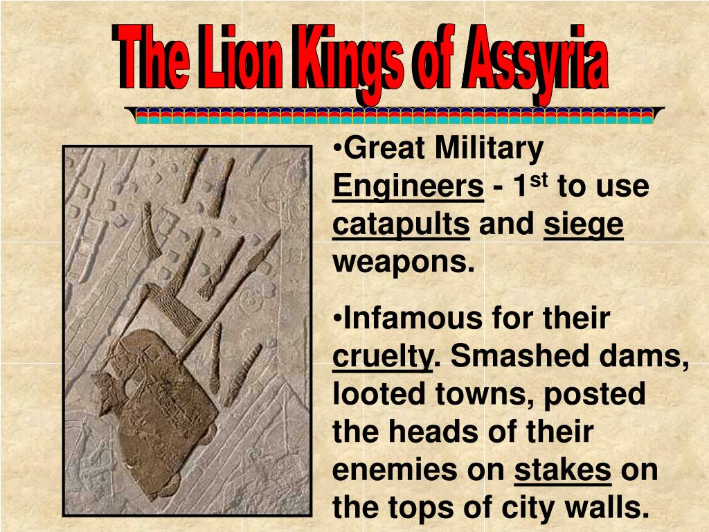The Lion Kings of Assyria The Lion Kings of Assyria • Great Military Engineers - 1st to use catapults and siege weapons. • Infamous for their cruelty. Smashed dams, looted towns, posted the heads of their enemies on stakes on the tops of city walls.