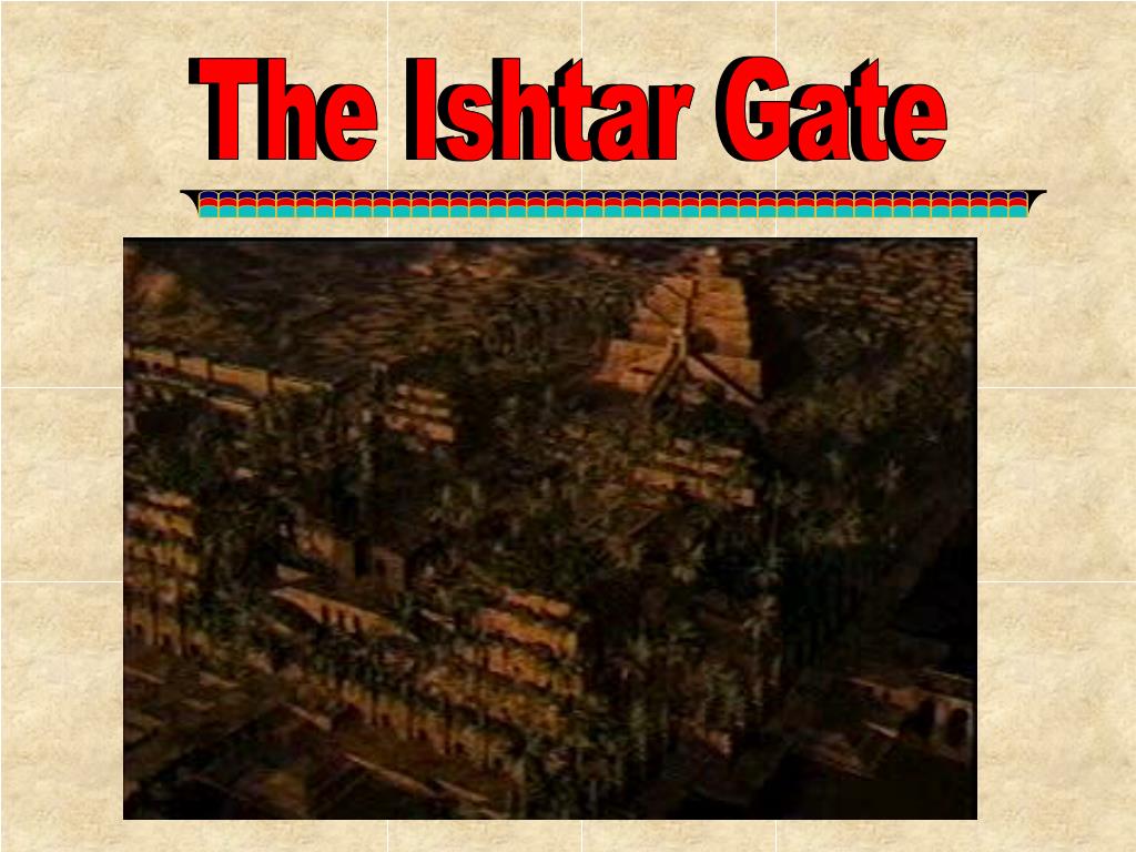 The Ishtar Gate The Ishtar Gate • 1 of 8Gates built by King Nebuchadnezzar II. • Dedicated to the goddess Ishtar, this inner gate was the processional entrance into Babylon. The Ishtar Gate