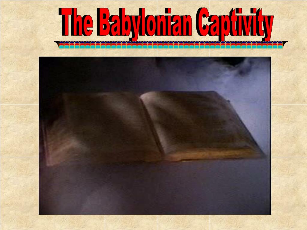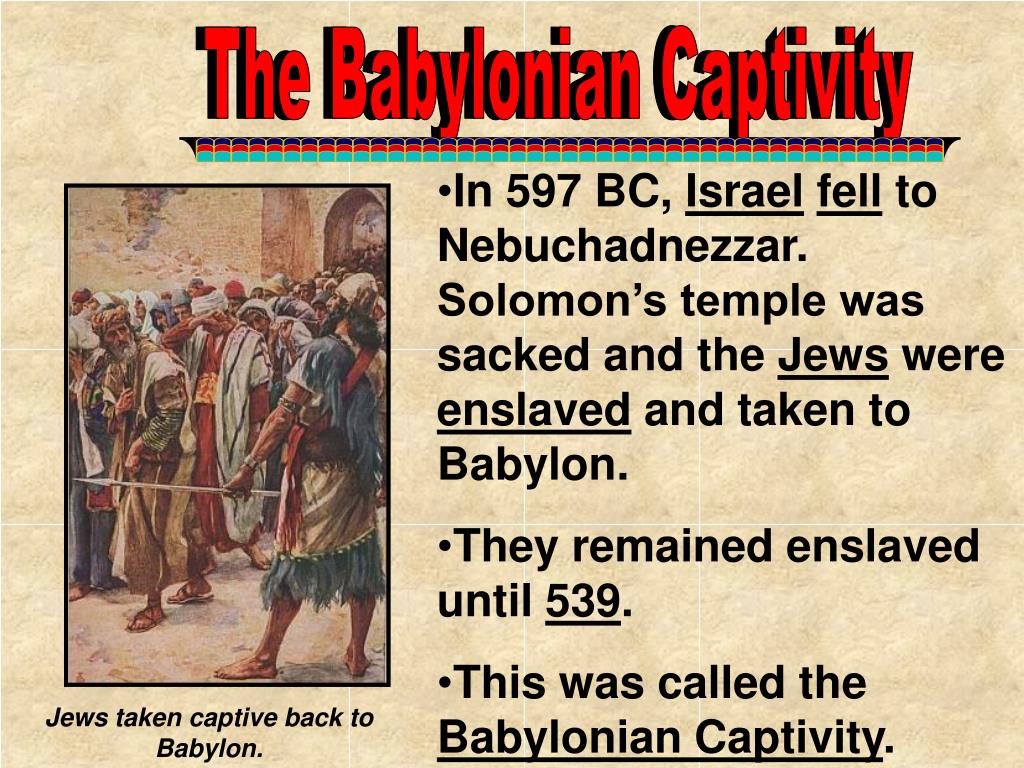 The Babylonian Captivity The Babylonian Captivity • In 597 BC, Israelfell to Nebuchadnezzar. Solomon’s temple was sacked and the Jews were enslaved and taken to Babylon. • They remained enslaved until 539. • This was called the Babylonian Captivity. Jews taken captive back to Babylon.