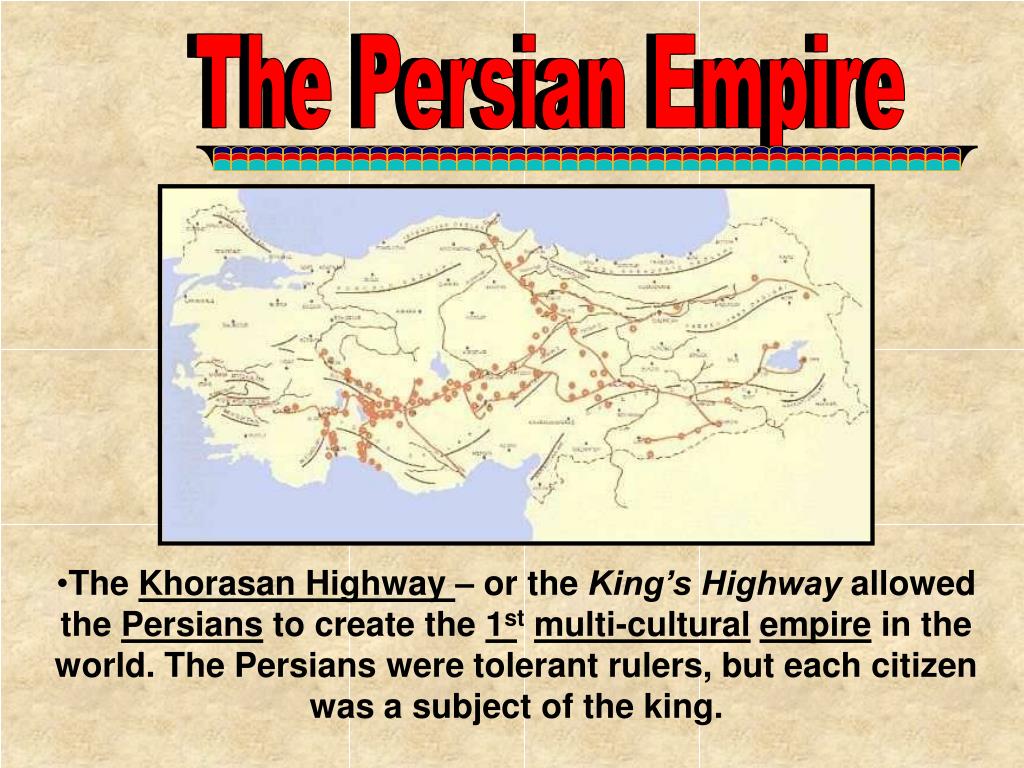 The Persian Empire The Persian Empire • The Khorasan Highway – or the King’s Highway allowed the Persians to create the 1stmulti-culturalempire in the world. The Persians were tolerant rulers, but each citizen was a subject of the king.