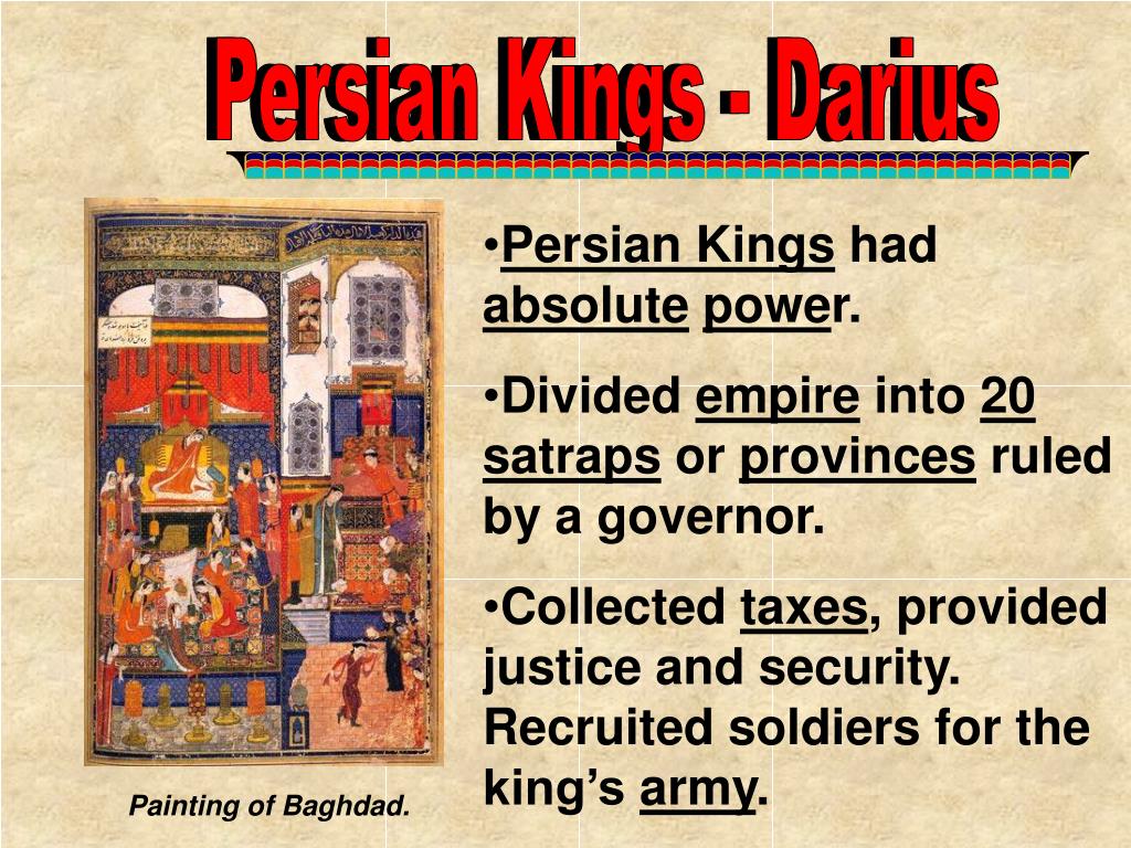 Persian Kings - Darius Persian Kings - Darius • Persian Kings had absolutepower. • Divided empire into 20satraps or provinces ruled by a governor. • Collected taxes, provided justice and security. Recruited soldiers for the king’s army. Painting of Baghdad.