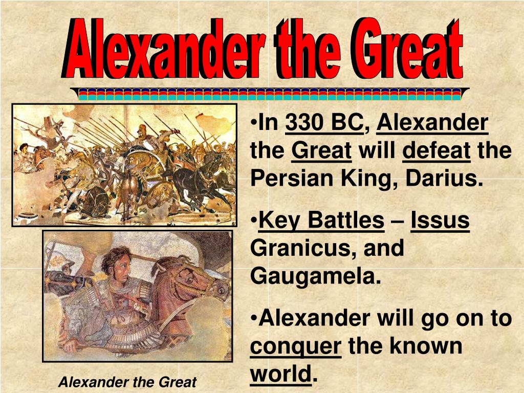 Alexander the Great Alexander the Great • In 330 BC, Alexander the Great will defeat the Persian King, Darius. • Key Battles – Issus Granicus, and Gaugamela. • Alexander will go on to conquer the known world. Alexander the Great