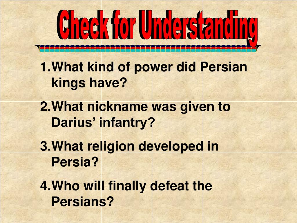 Check for Understanding Check for Understanding • What kind of power did Persian kings have? • What nickname was given to Darius’ infantry? • What religion developed in Persia? • Who will finally defeat the Persians?
