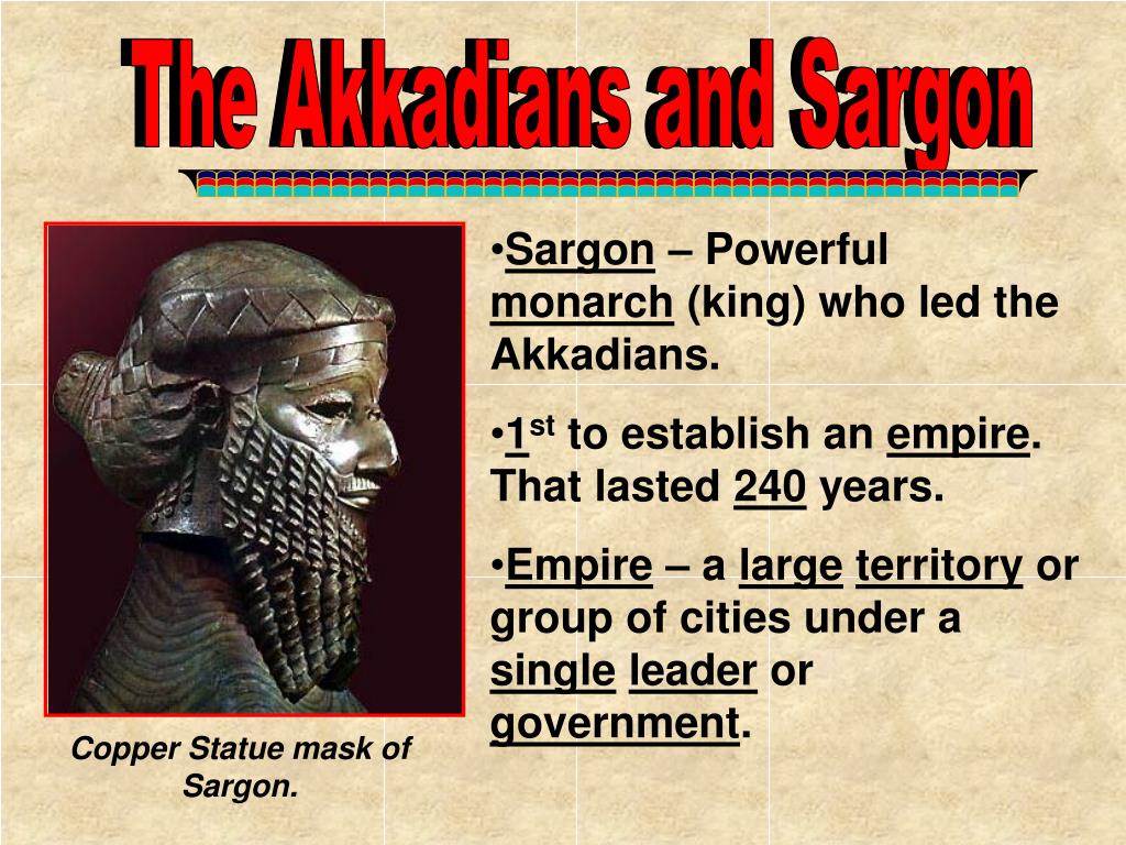 The Akkadians and Sargon The Akkadians and Sargon • Sargon – Powerful monarch (king) who led the Akkadians. • 1st to establish an empire. That lasted 240 years. • Empire – a largeterritory or group of cities under a singleleader or government. Copper Statue mask of Sargon.