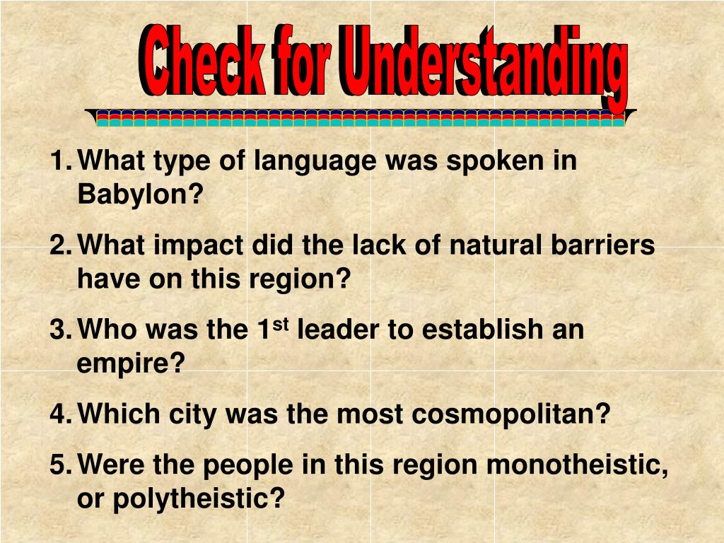 Check for Understanding Check for Understanding • What type of language was spoken in Babylon? • What impact did the lack of natural barriers have on this region? • Who was the 1st leader to establish an empire? • Which city was the most cosmopolitan? • Were the people in this region monotheistic, or polytheistic?
