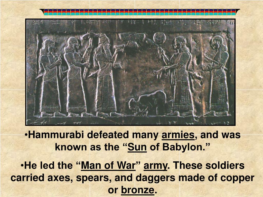 Hammurabi defeated many armies, and was known as the “Sun of Babylon.” • He led the “Man of War” army. These soldiers carried axes, spears, and daggers made of copper or bronze.