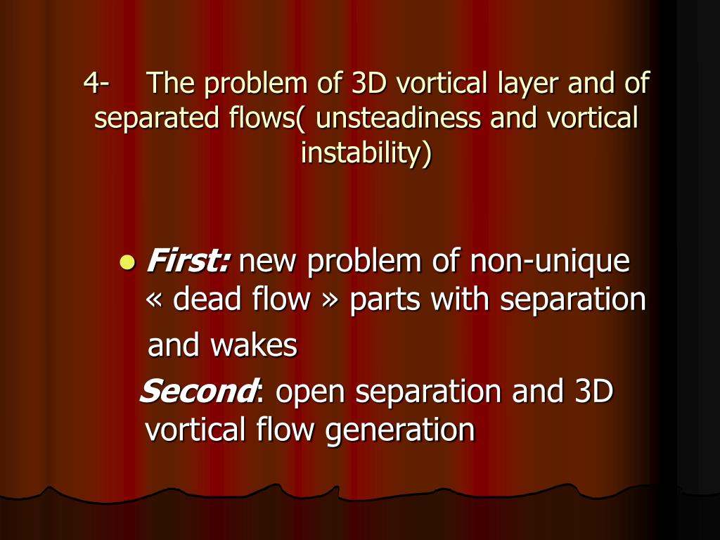 4- The problem of 3D vortical layer and of separated flows( unsteadiness and vortical instability) • First: new problem of non-unique « dead flow » parts with separation and wakes Second: open separation and 3D vortical flow generation