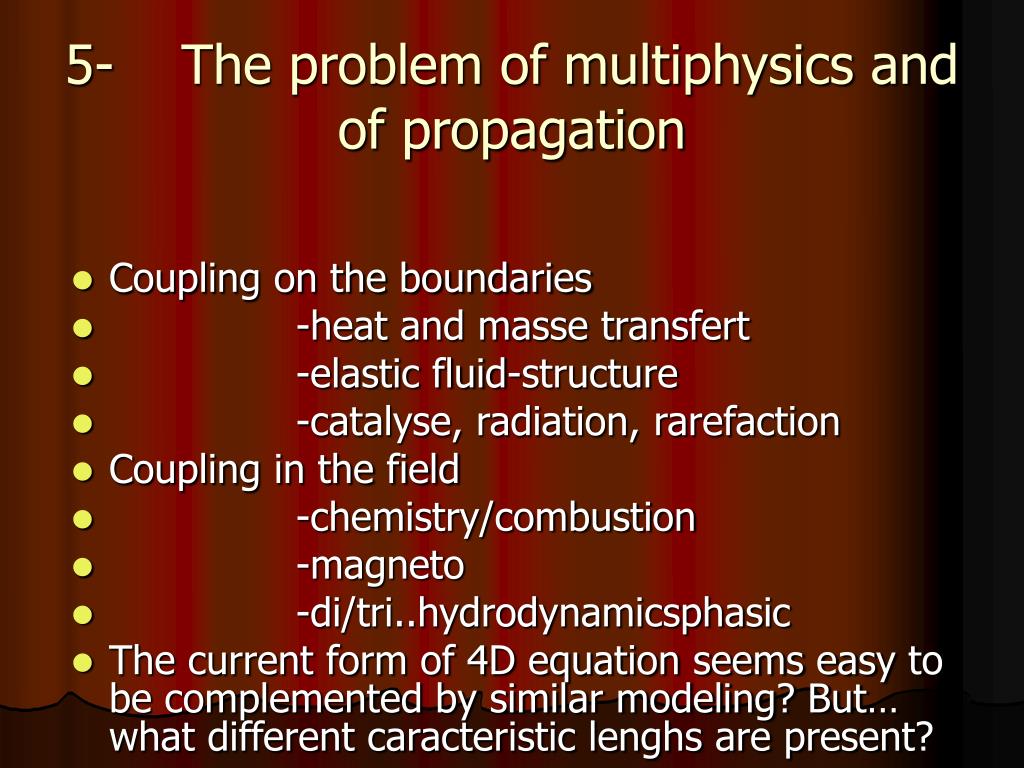5- The problem of multiphysics and of propagation • Coupling on the boundaries • -heat and masse transfert • -elastic fluid-structure • -catalyse, radiation, rarefaction • Coupling in the field • -chemistry/combustion • -magneto • -di/tri..hydrodynamicsphasic • The current form of 4D equation seems easy to be complemented by similar modeling? But… what different caracteristic lenghs are present?