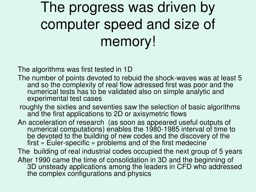 The progress was driven by computer speed and size of memory! The algorithms was first tested in 1D The number of points devoted to rebuid the shock-waves was at least 5 and so the complexity of real flow adressed first was poor and the numerical tests has to be validated also on simple analytic and experimental test cases roughly the sixties and seventies saw the selection of basic algorithms and the first applications to 2D or axisymetric flows An acceleration of research (as soon as appeared useful outputs of numerical computations) enables the 1980-1985 interval of time to be devoted to the building of new codes and the discovery of the first « Euler-specific » problems and of the first medecine The building of real industrial codes occupied the next group of 5 years After 1990 came the time of consolidation in 3D and the beginning of 3D unsteady applications among the leaders in CFD who addressed the complex configurations and physics