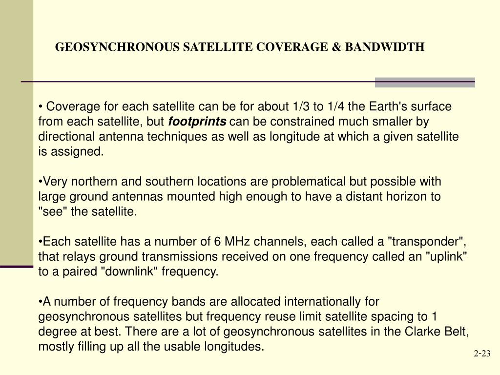 GEOSYNCHRONOUS SATELLITE COVERAGE & BANDWIDTH • Coverage for each satellite can be for about 1/3 to 1/4 the Earth's surface from each satellite, but footprints can be constrained much smaller by directional antenna techniques as well as longitude at which a given satellite is assigned. • Very northern and southern locations are problematical but possible with large ground antennas mounted high enough to have a distant horizon to "see" the satellite. • Each satellite has a number of 6 MHz channels, each called a "transponder", that relays ground transmissions received on one frequency called an "uplink" to a paired "downlink" frequency. • A number of frequency bands are allocated internationally for geosynchronous satellites but frequency reuse limit satellite spacing to 1 degree at best. There are a lot of geosynchronous satellites in the Clarke Belt, mostly filling up all the usable longitudes.