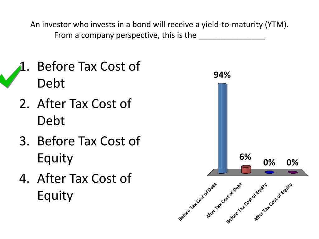 An investor who invests in a bond will receive a yield-to-maturity (YTM). From a company perspective, this is the _______________ • Before Tax Cost of Debt • After Tax Cost of Debt • Before Tax Cost of Equity • After Tax Cost of Equity