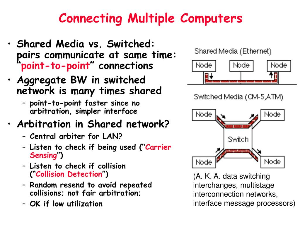 Connecting Multiple Computers • Shared Media vs. Switched: pairs communicate at same time: “point-to-point” connections • Aggregate BW in switched network is many times shared • point-to-point faster since no arbitration, simpler interface • Arbitration in Shared network? • Central arbiter for LAN? • Listen to check if being used (“Carrier Sensing”) • Listen to check if collision (“Collision Detection”) • Random resend to avoid repeated collisions; not fair arbitration; • OK if low utilization (A. K. A. data switching interchanges, multistage interconnection networks, interface message processors)