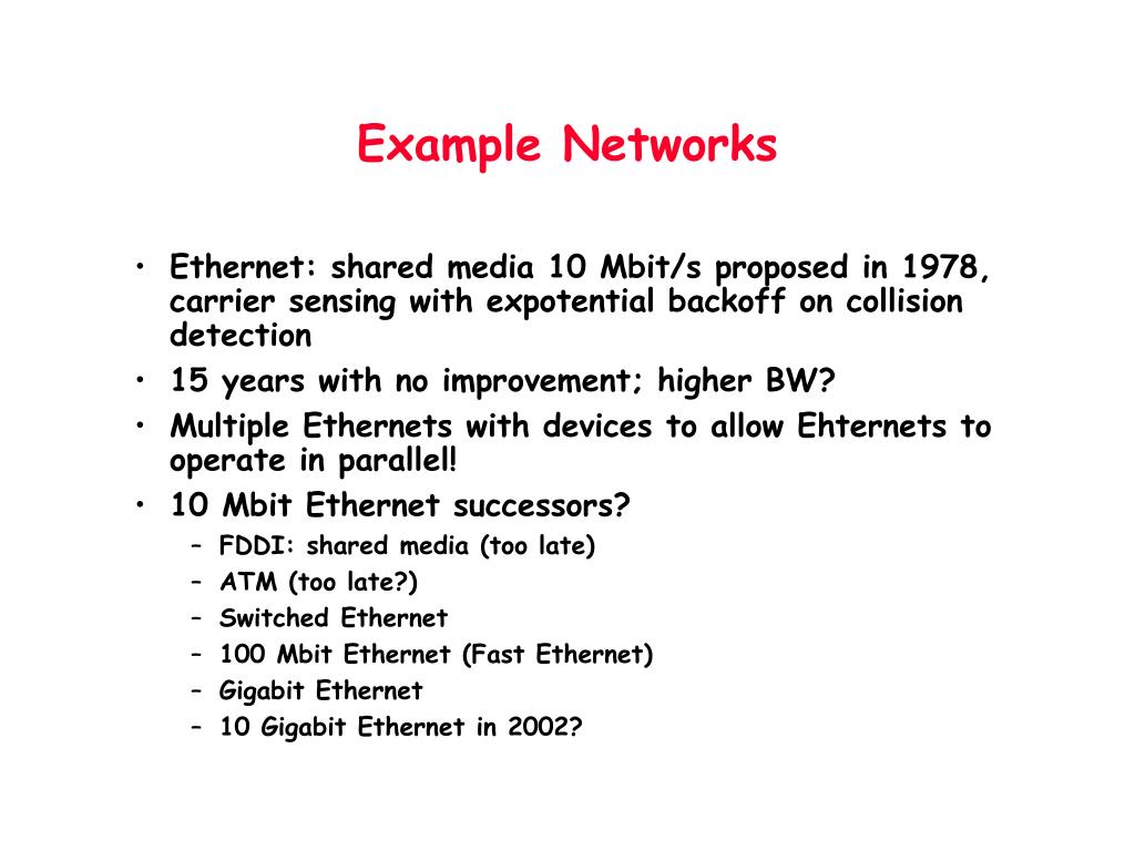 Example Networks • Ethernet: shared media 10 Mbit/s proposed in 1978, carrier sensing with expotential backoff on collision detection • 15 years with no improvement; higher BW? • Multiple Ethernets with devices to allow Ehternets to operate in parallel! • 10 Mbit Ethernet successors? • FDDI: shared media (too late) • ATM (too late?) • Switched Ethernet • 100 Mbit Ethernet (Fast Ethernet) • Gigabit Ethernet • 10 Gigabit Ethernet in 2002?