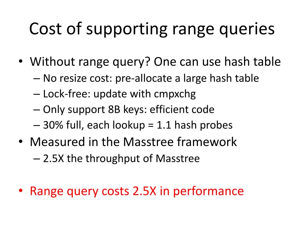 Cost of supporting range queries • Without range query? One can use hash table • No resize cost: pre-allocate a large hash table • Lock-free: update with cmpxchg • Only support 8B keys: efficient code • 30% full, each lookup = 1.1 hash probes • Measured in the Masstree framework • 2.5X the throughput of Masstree • Range query costs 2.5X in performance