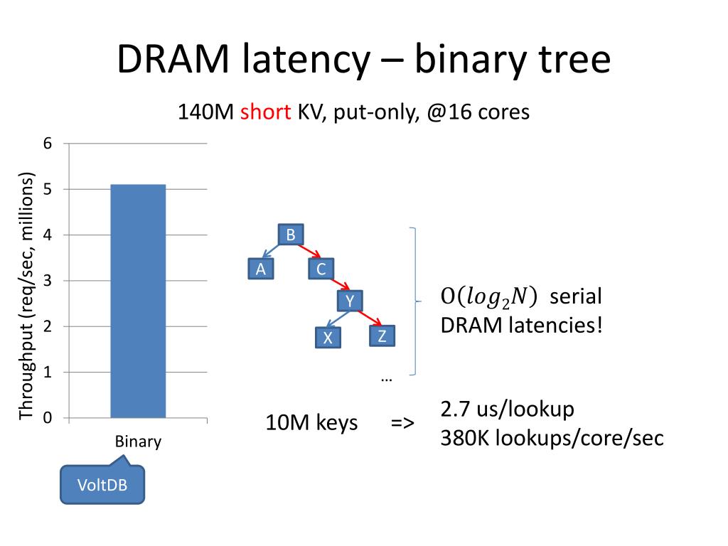 DRAM latency – binary tree 140M short KV, put-only, @16 cores Throughput (req/sec, millions) B A C serial DRAM latencies! Y Z X … 2.7 us/lookup 380K lookups/core/sec 10M keys => VoltDB