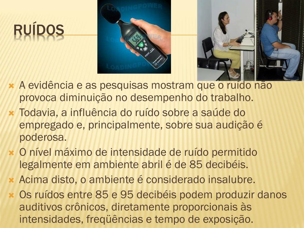 A evidência e as pesquisas mostram que o ruído não provoca diminuição no desempenho do trabalho. Todavia, a influência do ruído sobre a saúde do empregado e, principalmente, sobre sua audição é poderosa. O nível máximo de intensidade de ruído permitido legalmente em ambiente abril é de 85 decibéis. Acima disto, o ambiente é considerado insalubre. Os ruídos entre 85 e 95 decibéis podem produzir danos auditivos crônicos, diretamente proporcionais às intensidades, freqüências e tempo de exposição. Ruídos