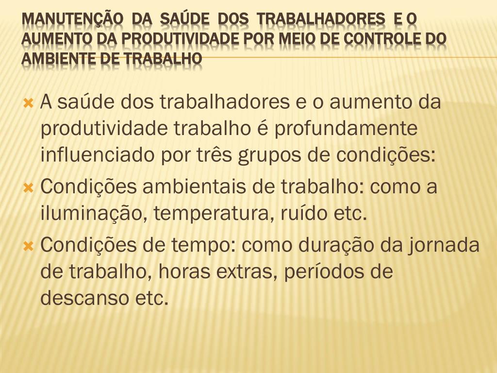 A saúde dos trabalhadores e o aumento da produtividade trabalho é profundamente influenciado por três grupos de condições: • Condições ambientais de trabalho: como a iluminação, temperatura, ruído etc. • Condições de tempo: como duração da jornada de trabalho, horas extras, períodos de descanso etc. Manutenção da saúde dos trabalhadores e o aumento da produtividade por meio de controle do ambiente de trabalho