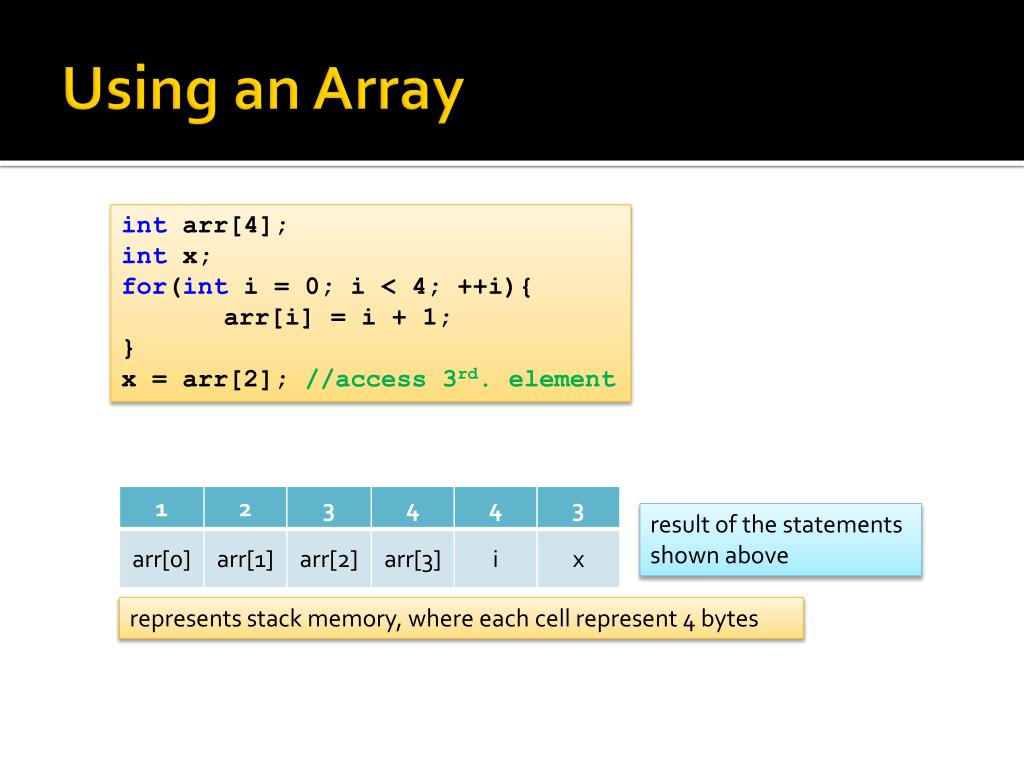 Using an Array intarr[4]; int x; for(inti = 0; i < 4; ++i){ arr[i] = i + 1; } x = arr[2]; //access 3rd. element result of the statements shown above represents stack memory, where each cell represent 4 bytes