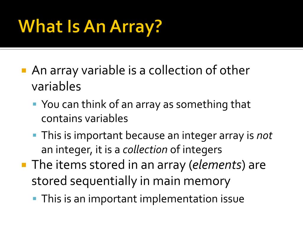 What Is An Array? • An array variable is a collection of other variables • You can think of an array as something that contains variables • This is important because an integer array is not an integer, it is a collectionof integers • The items stored in an array (elements) are stored sequentially in main memory • This is an important implementation issue